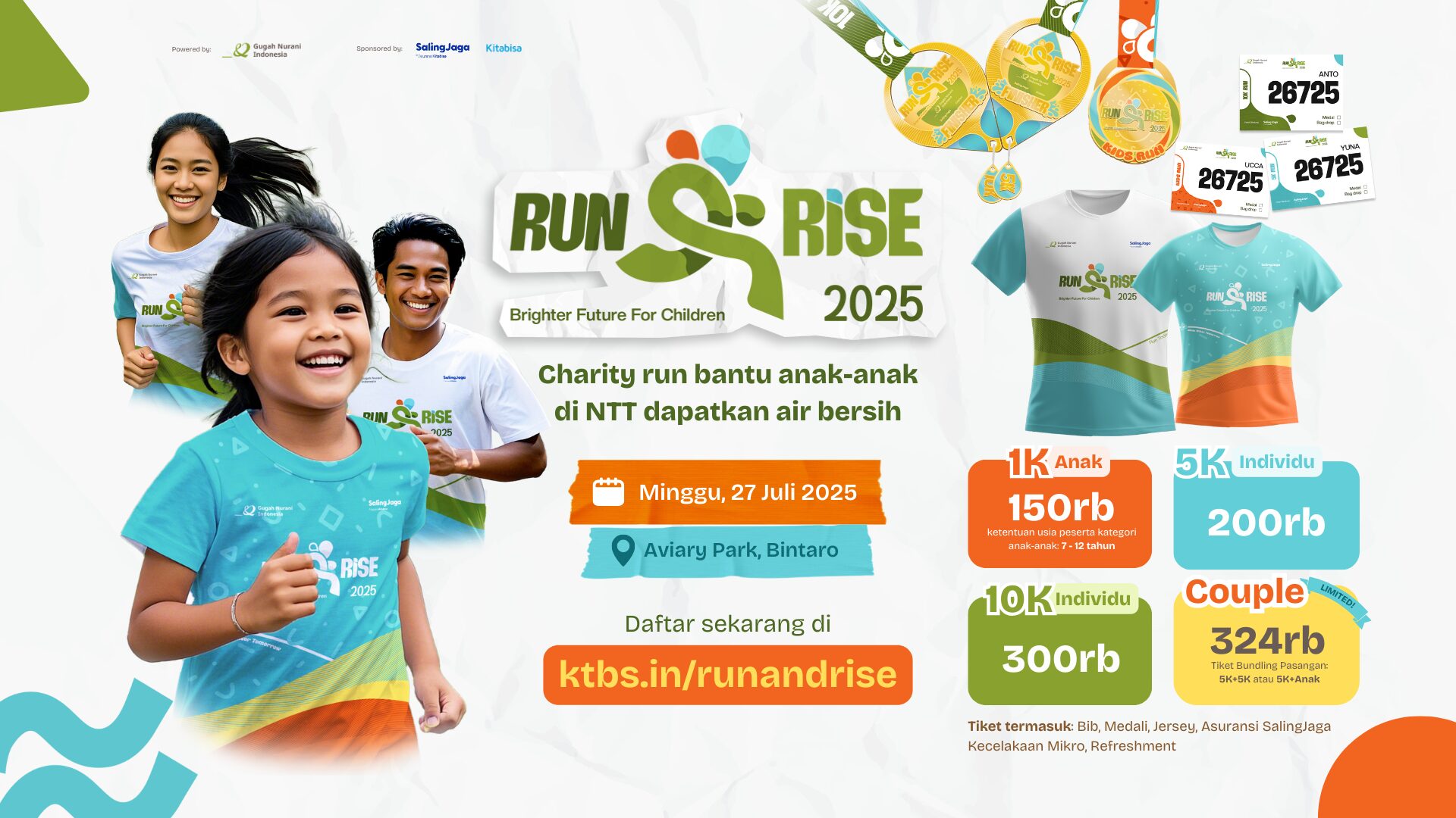 Tak hanya berlari, Run & Rise juga membawa misi kemanusiaan untuk mendekatkan anak-anak pelosok Indonesia dengan sumber air bersih di setiap langkah larimu. Run for Water, Run for Hope!